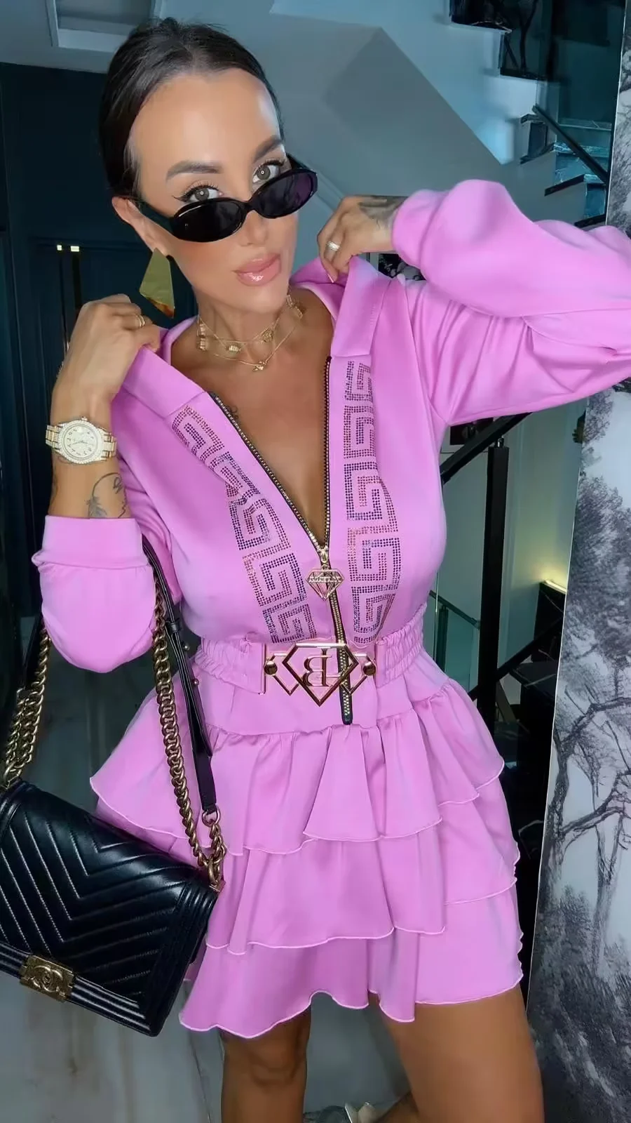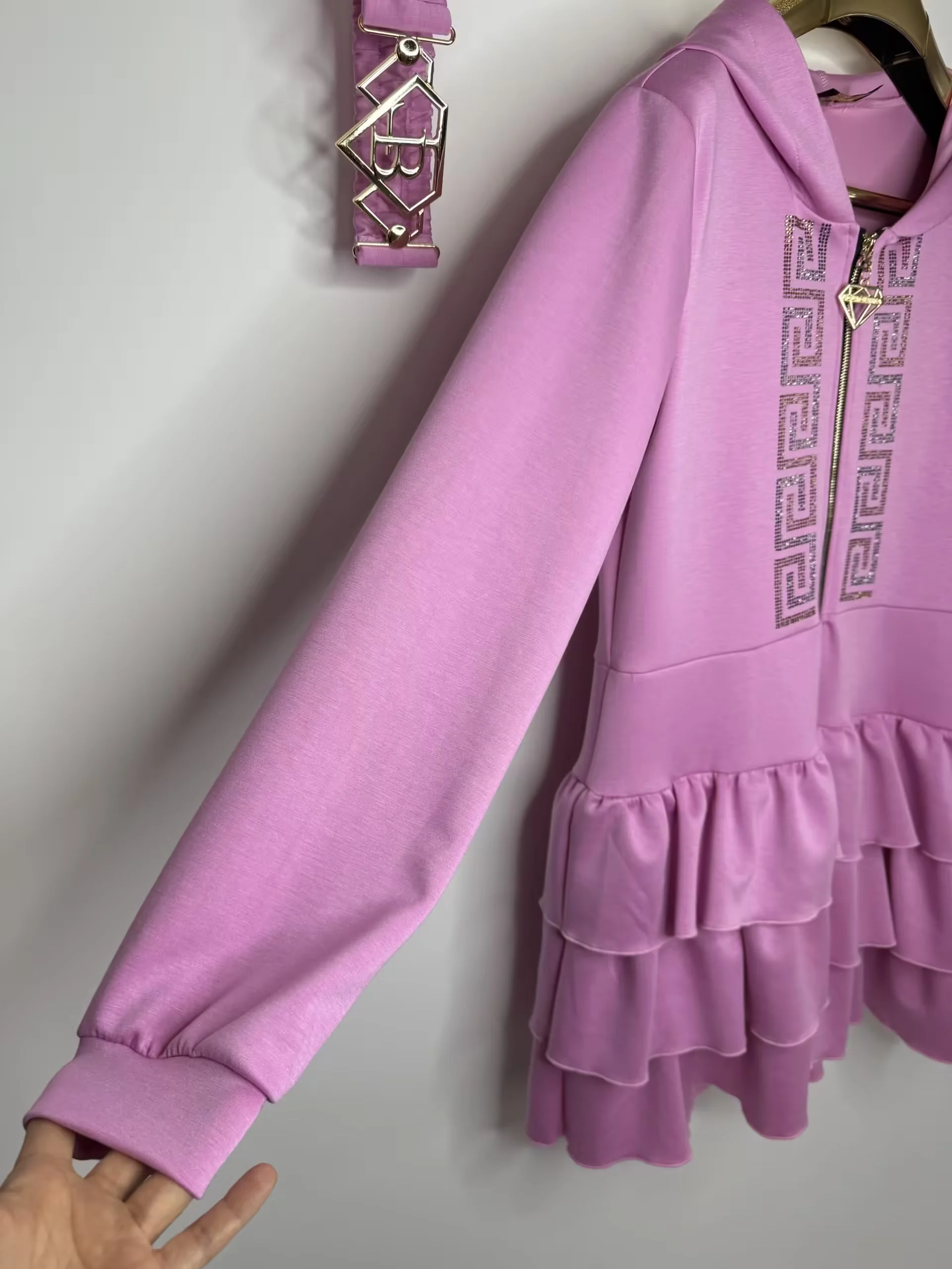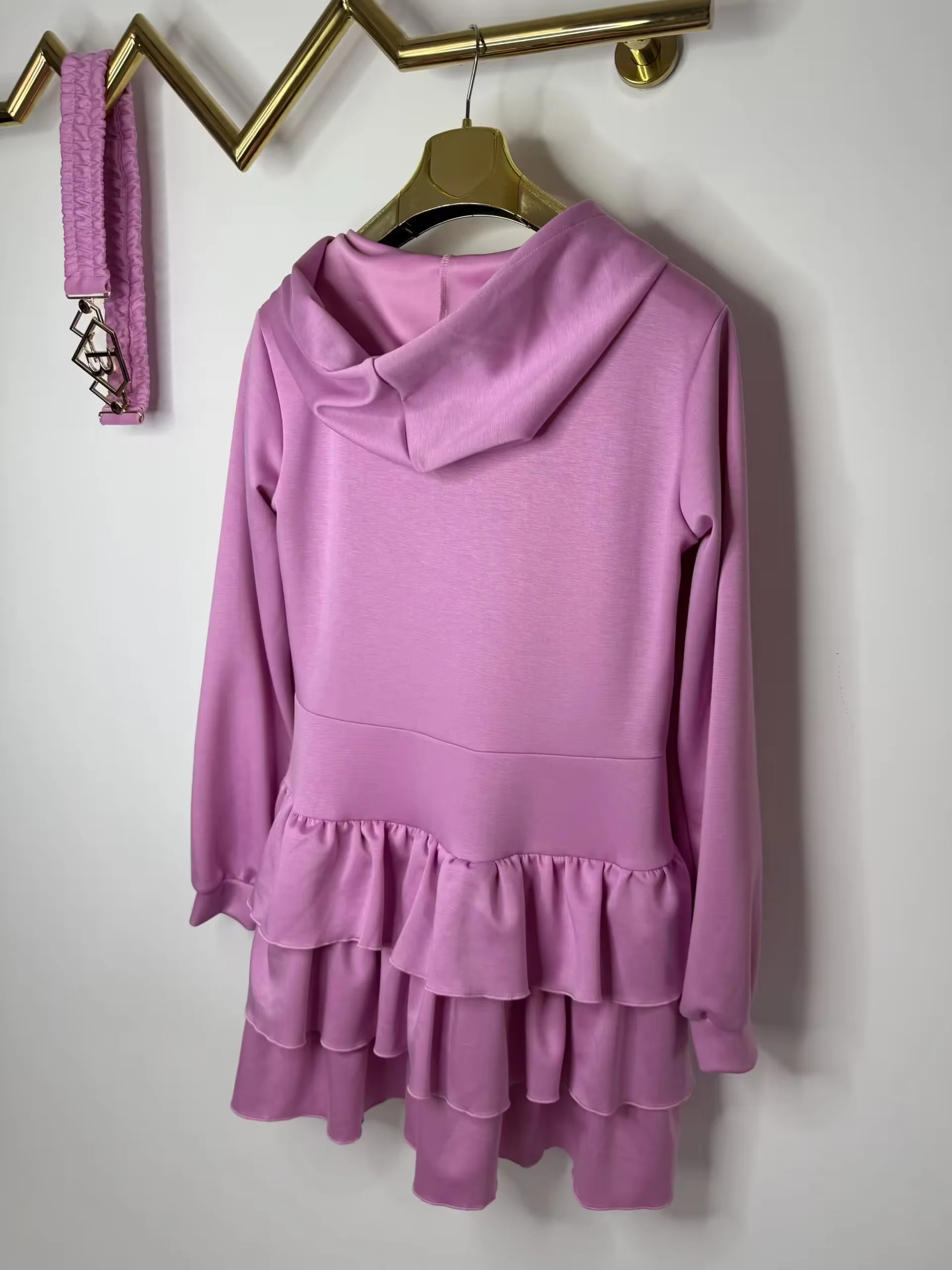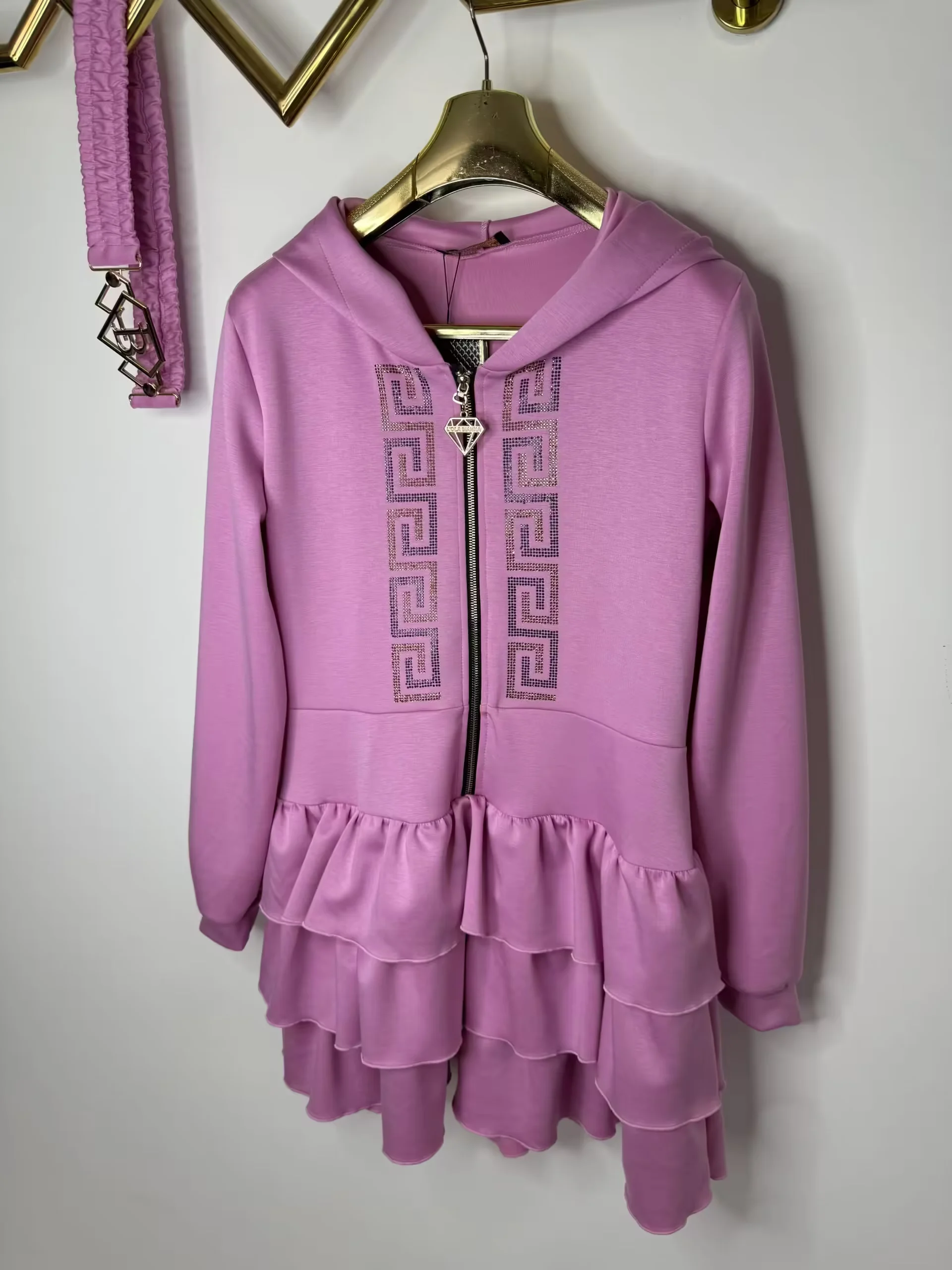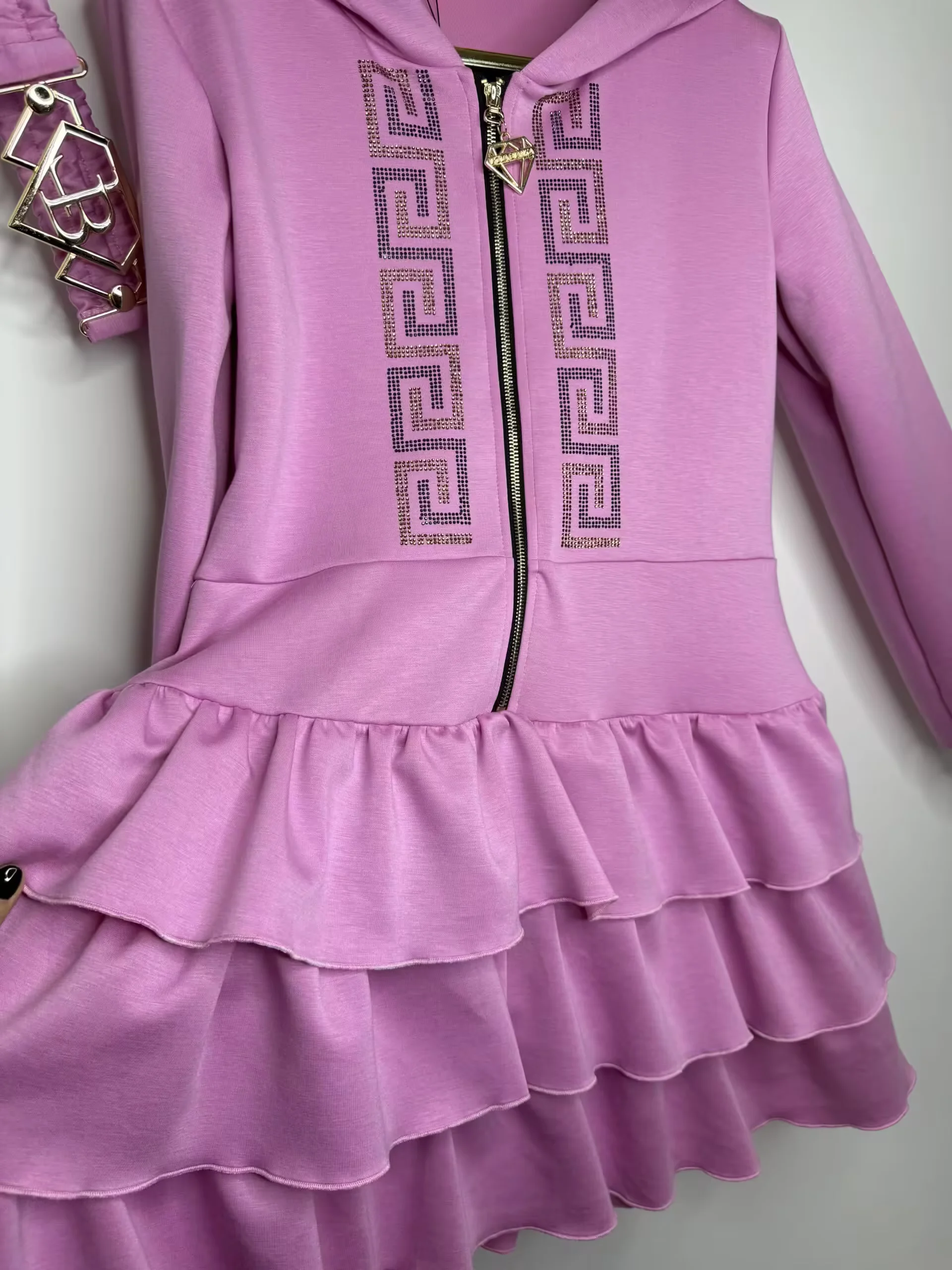 przepiękny model bardzo wygodnej sukienki zapinanej na zamek, zdobienie z cyrkonii na przodzie, z logowanym paskiem z klamrą, dodatkowo kaptur