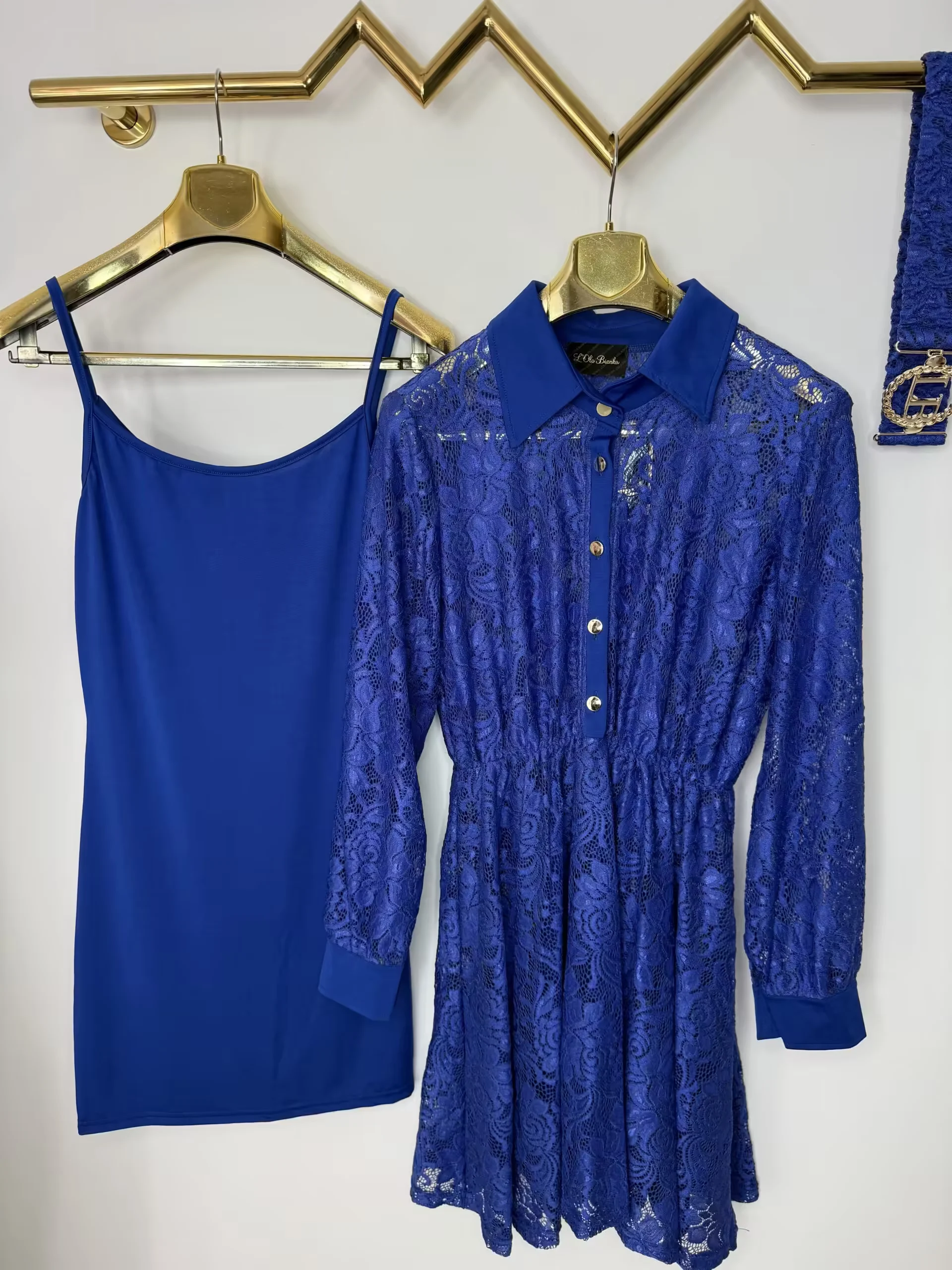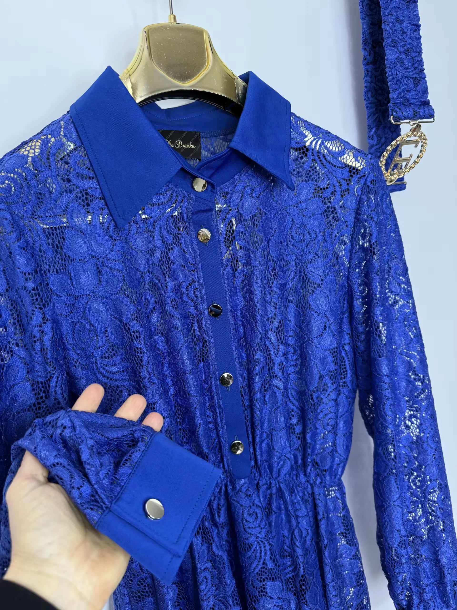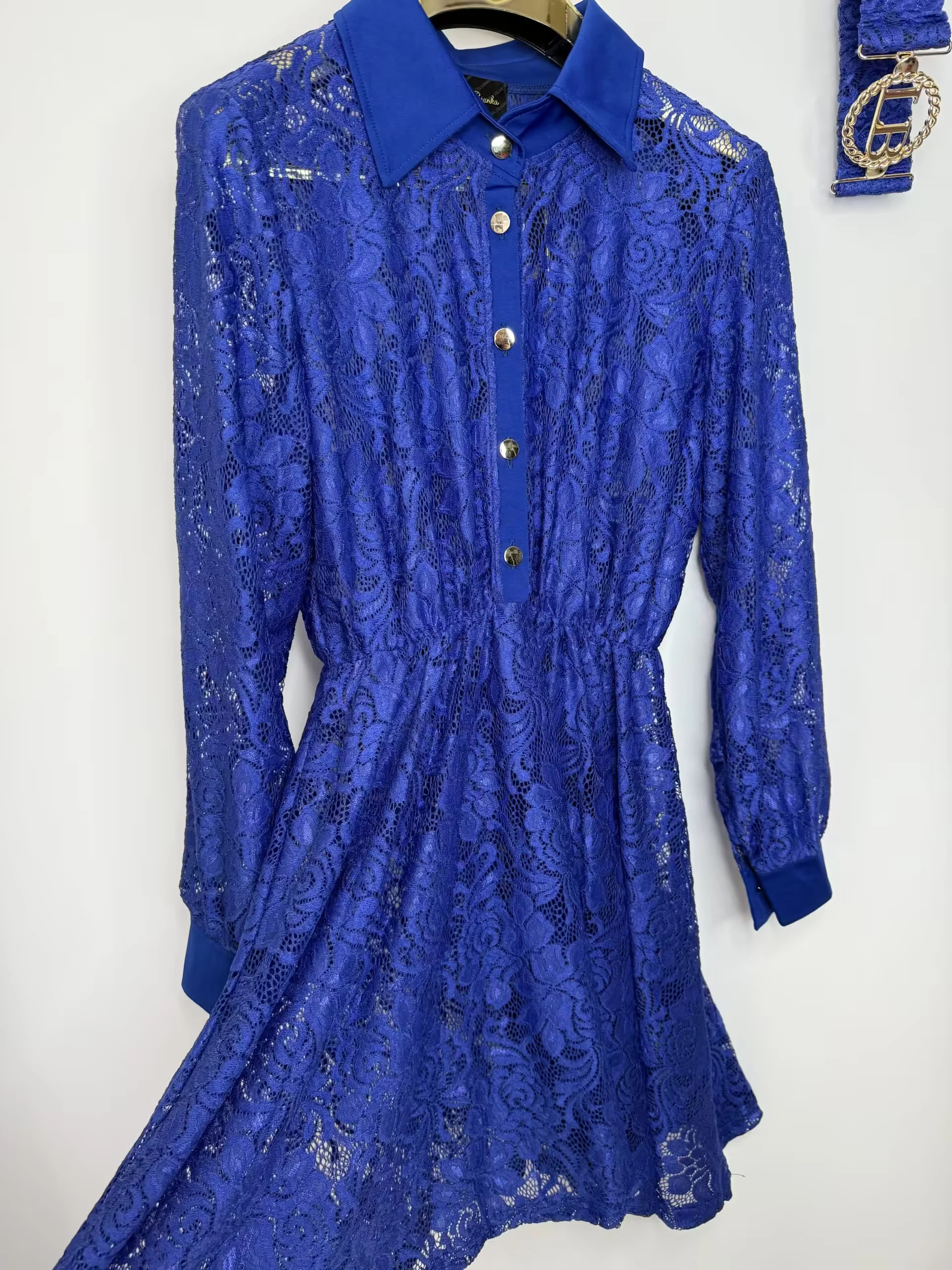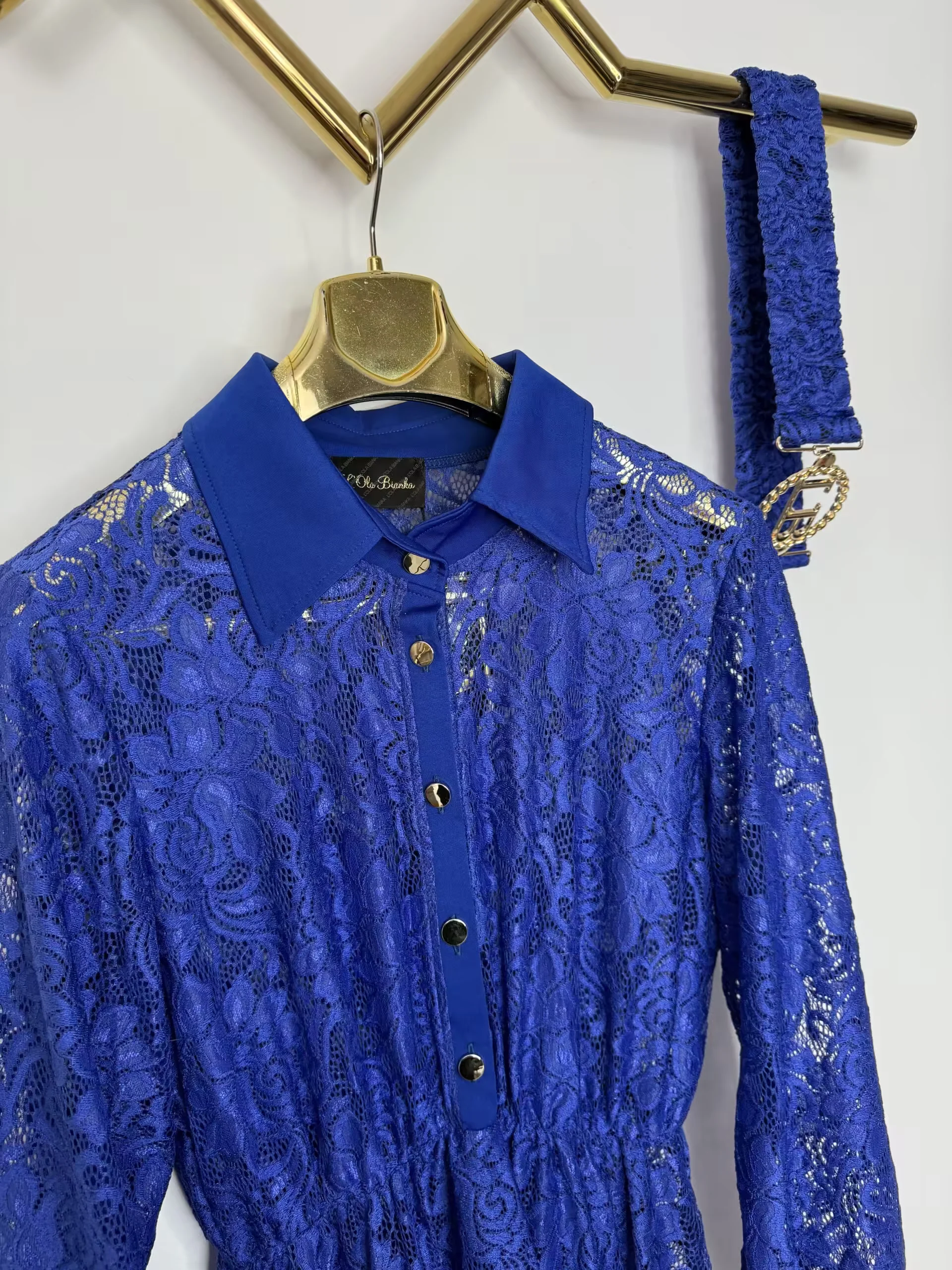Sukienka Lola Bianka sukienka wizytowa granatowa z koronki przepiękna 2 częściowa z paskiem w zestawie, rękawek długi zapinany na guziki, sukienka wykończona kołnierzykiem, do pasa zapinana…