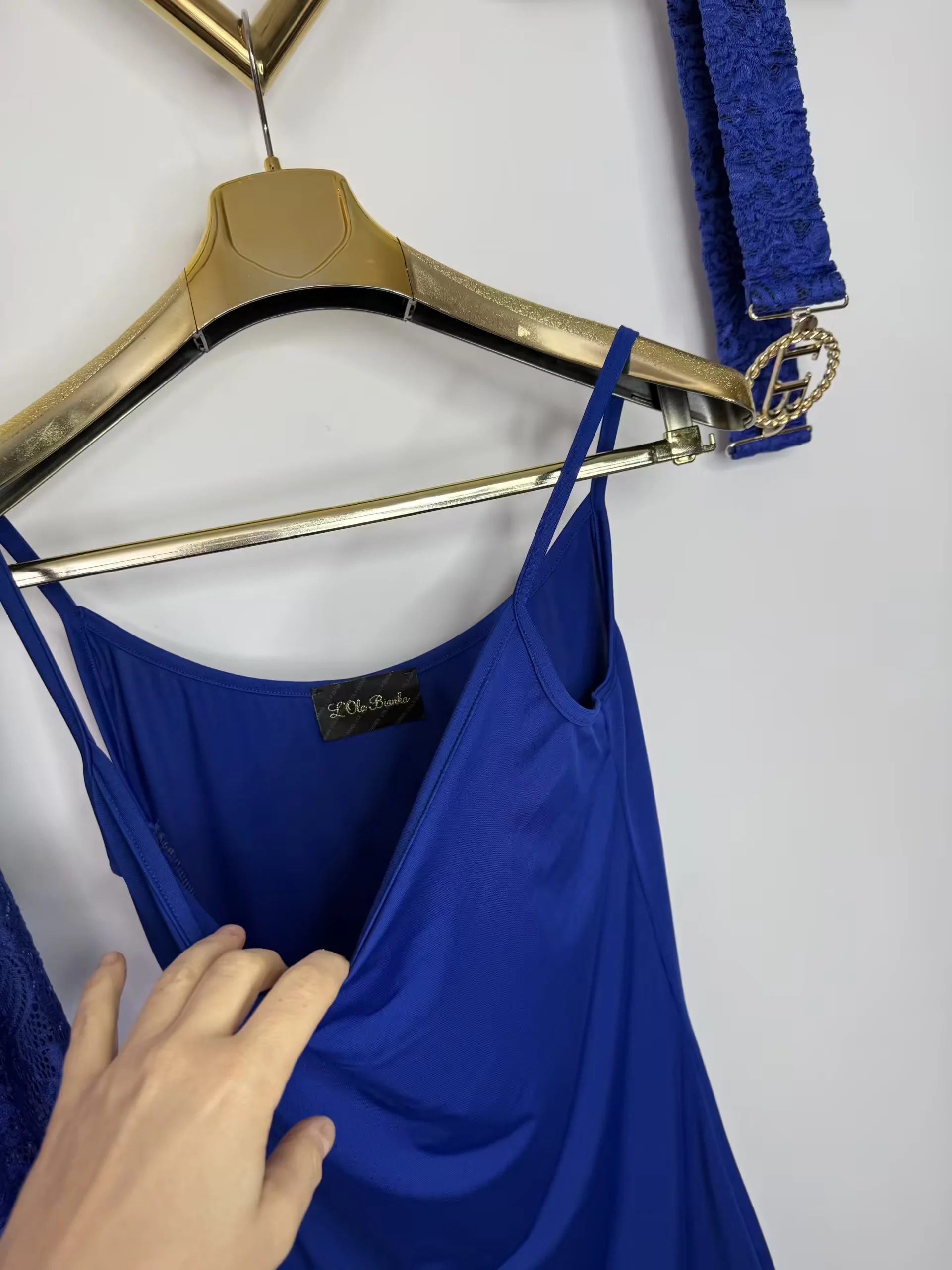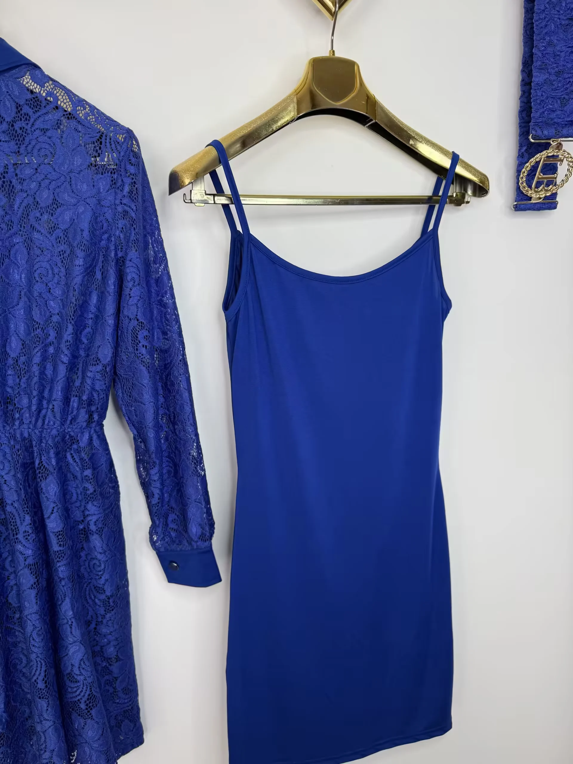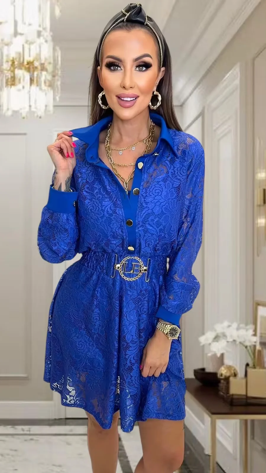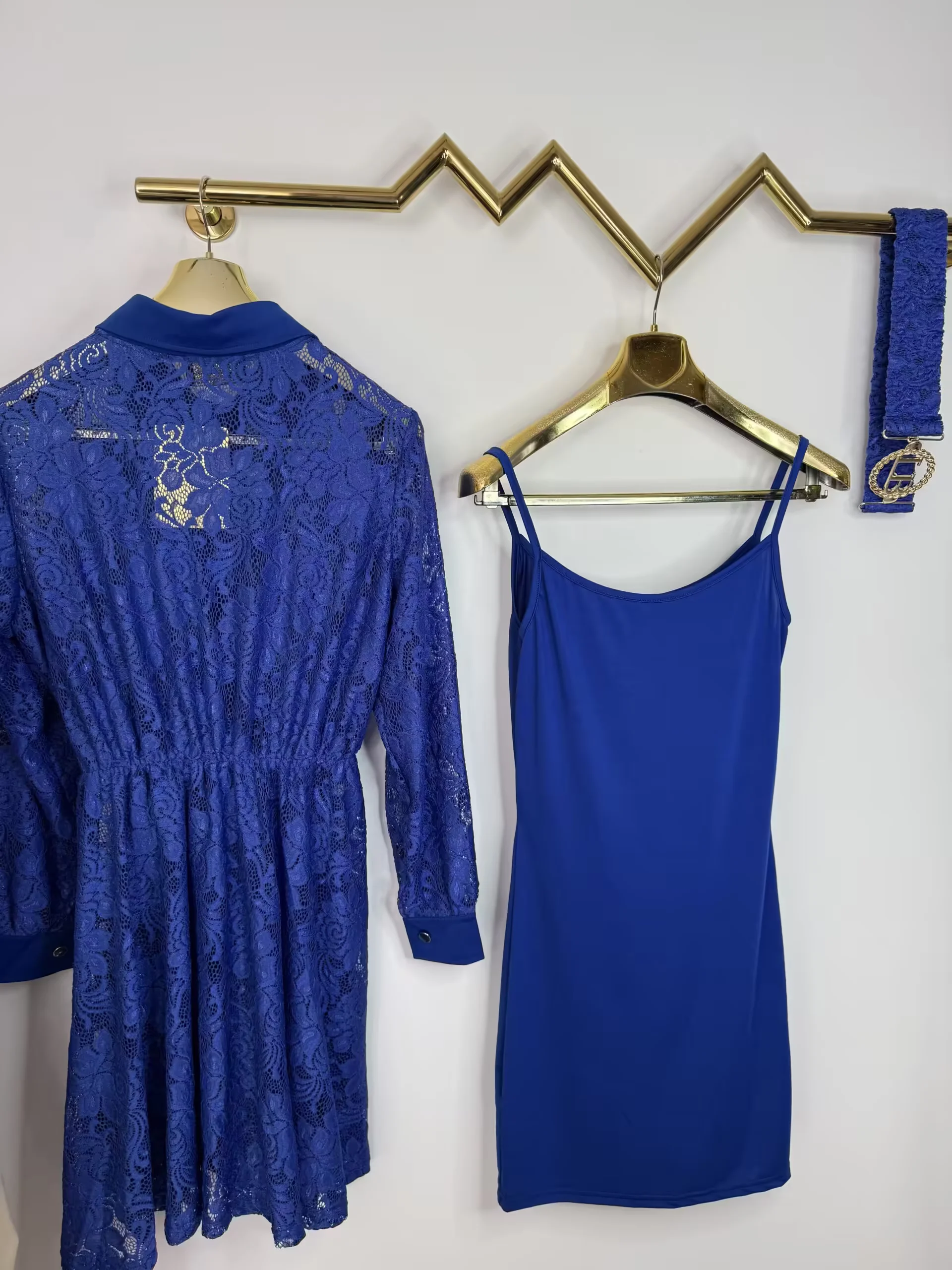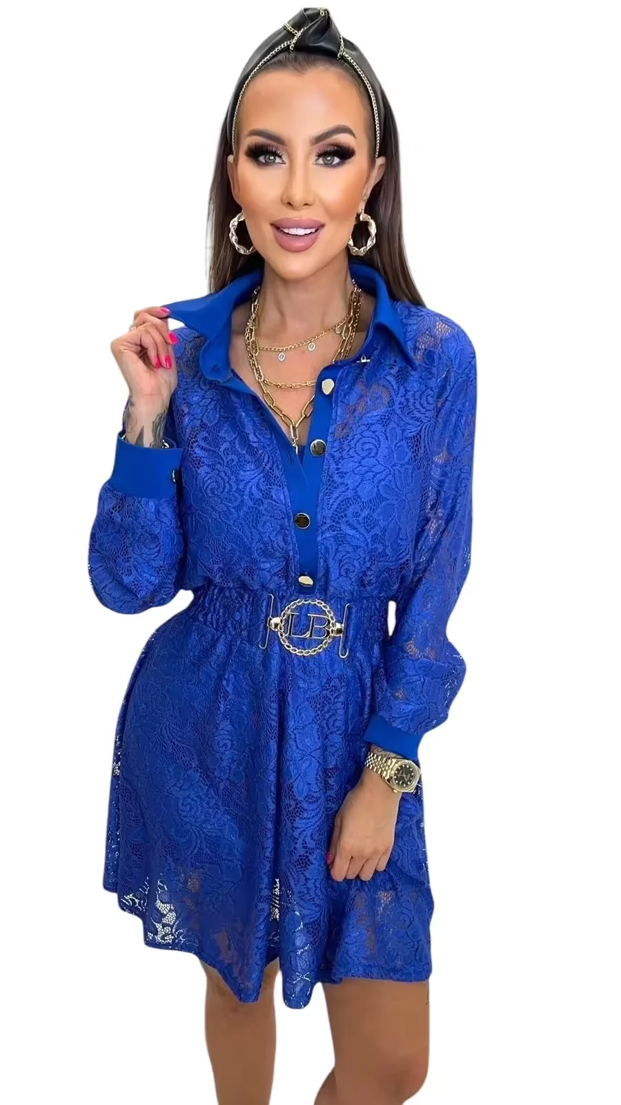Sukienka Lola Bianka sukienka wizytowa granatowa z koronki przepiękna 2 częściowa z paskiem w zestawie, rękawek długi zapinany na guziki, sukienka wykończona kołnierzykiem, do pasa zapinana…
