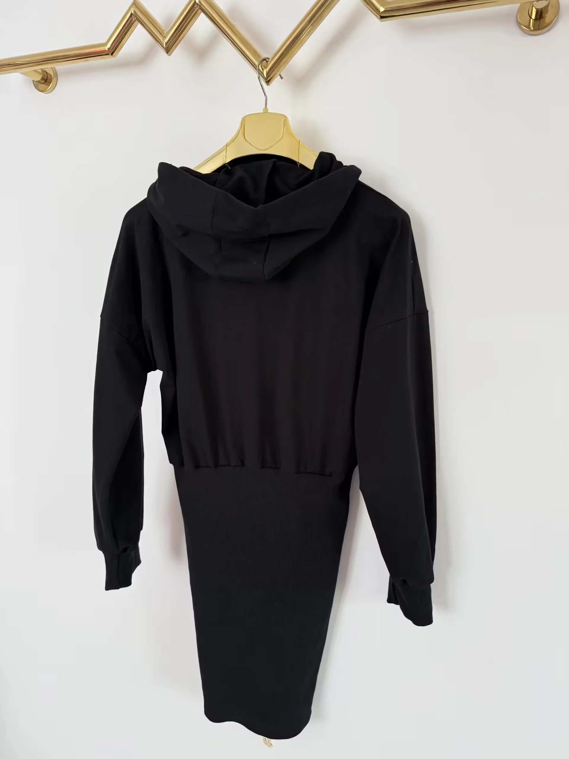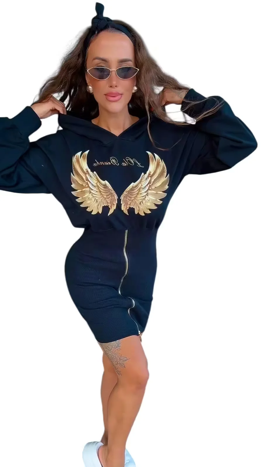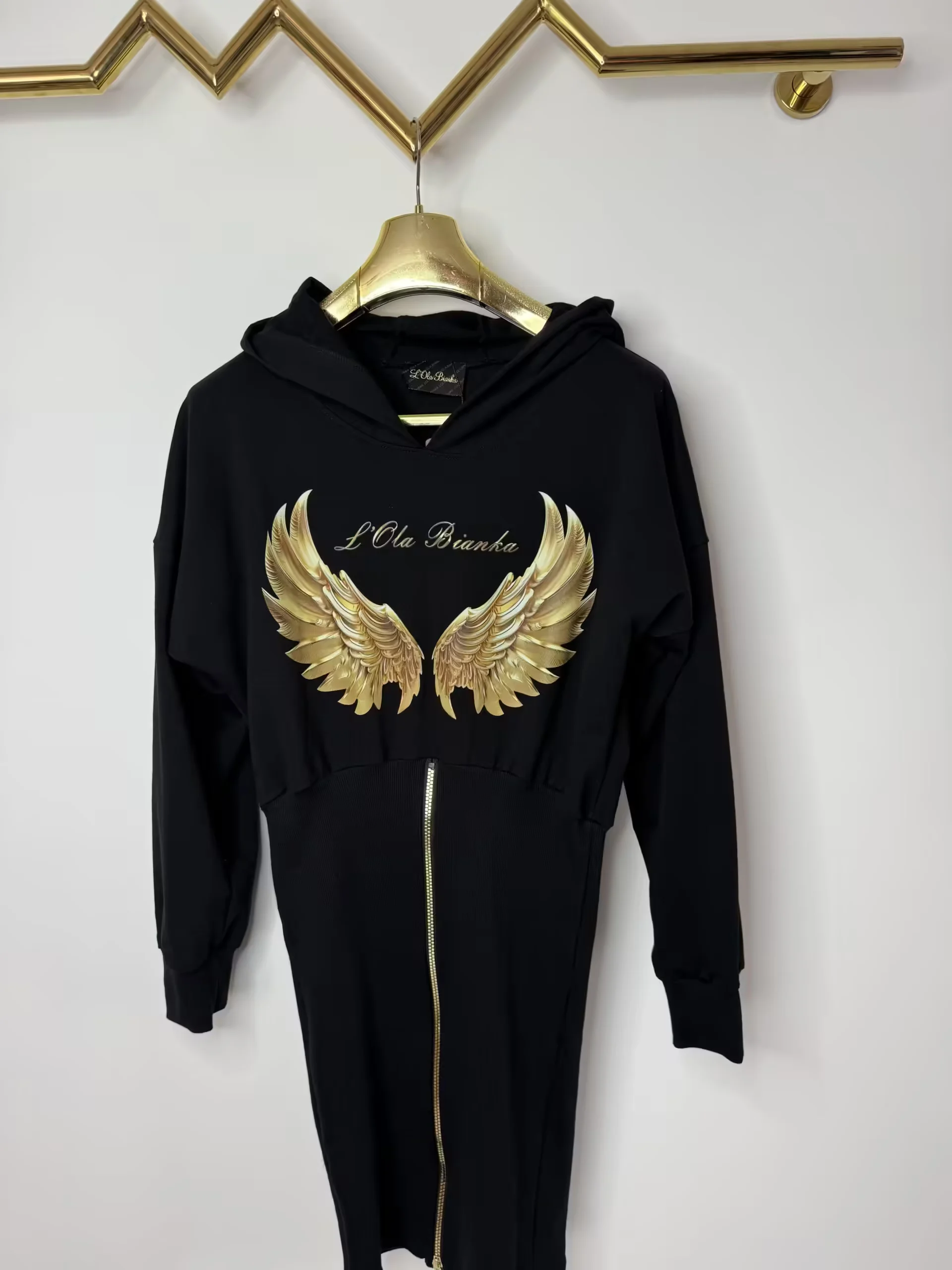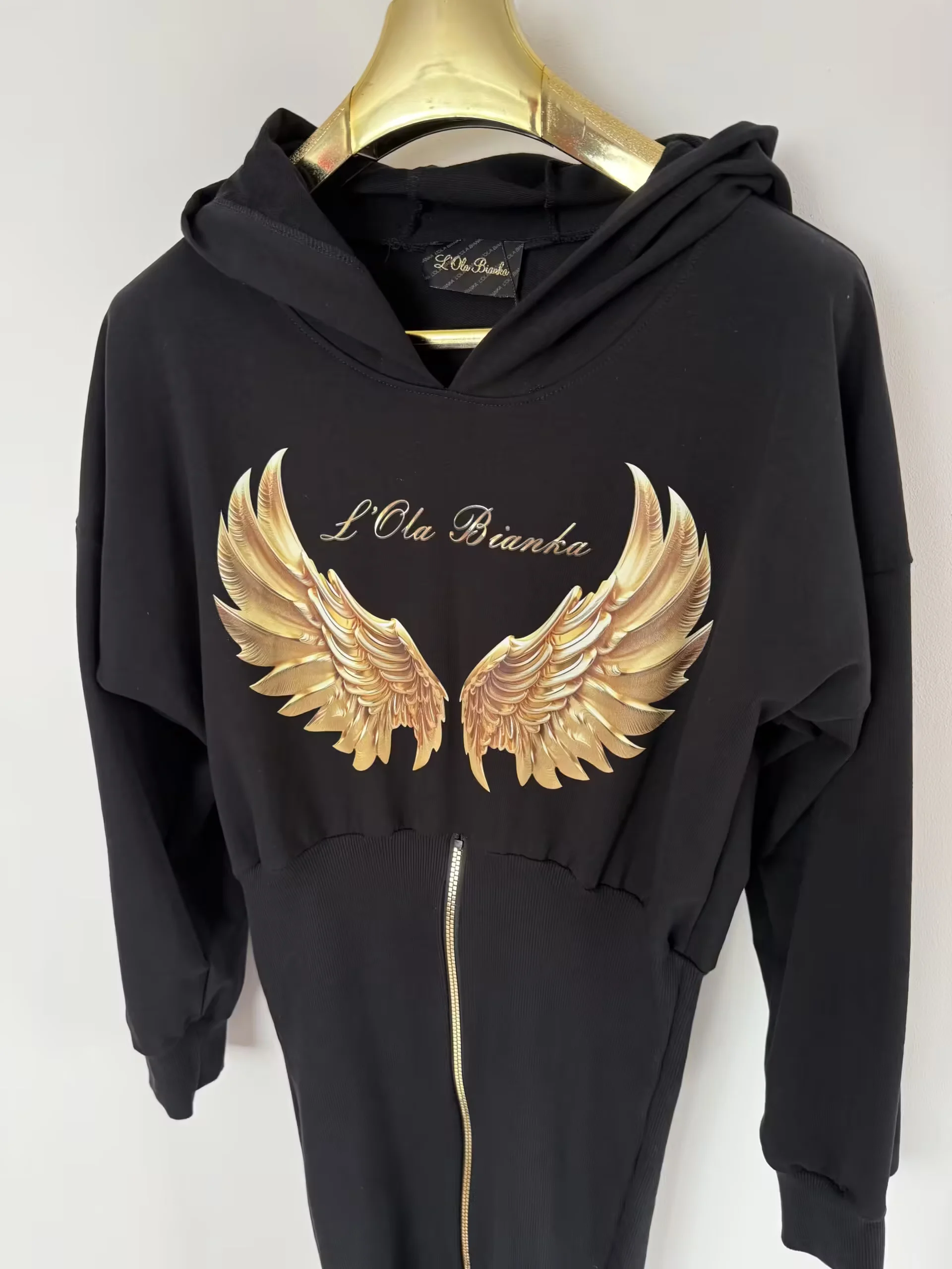 Sukienka Lola Bianka tunika dresowa czarna skrzydła w rozmiarze uniwersalnym pasuje na SML, na przodzie nadruk skrzydeł dół rozpinany rękawek długi bardzo wygodny model dresówki z kapturem do trampek