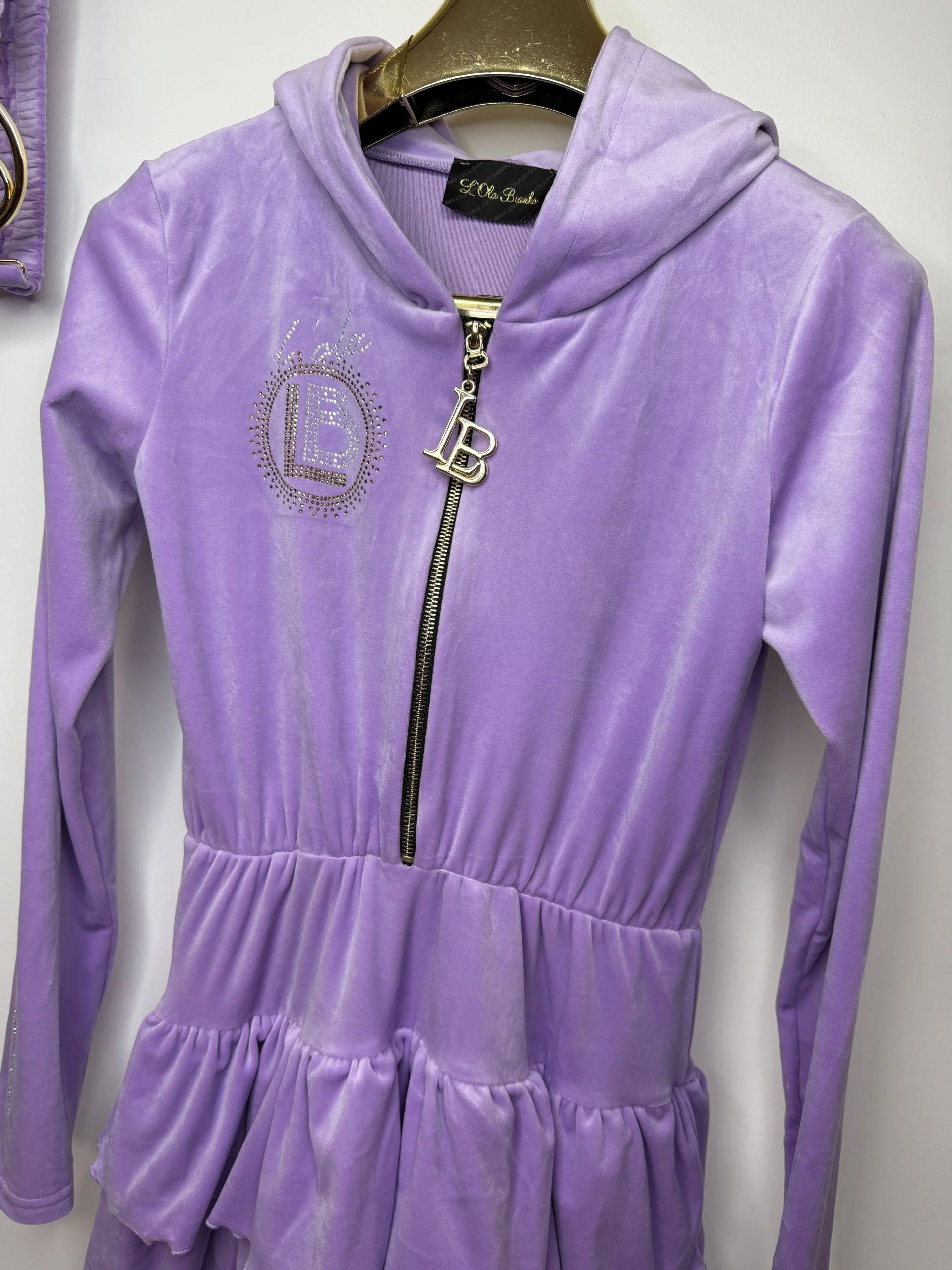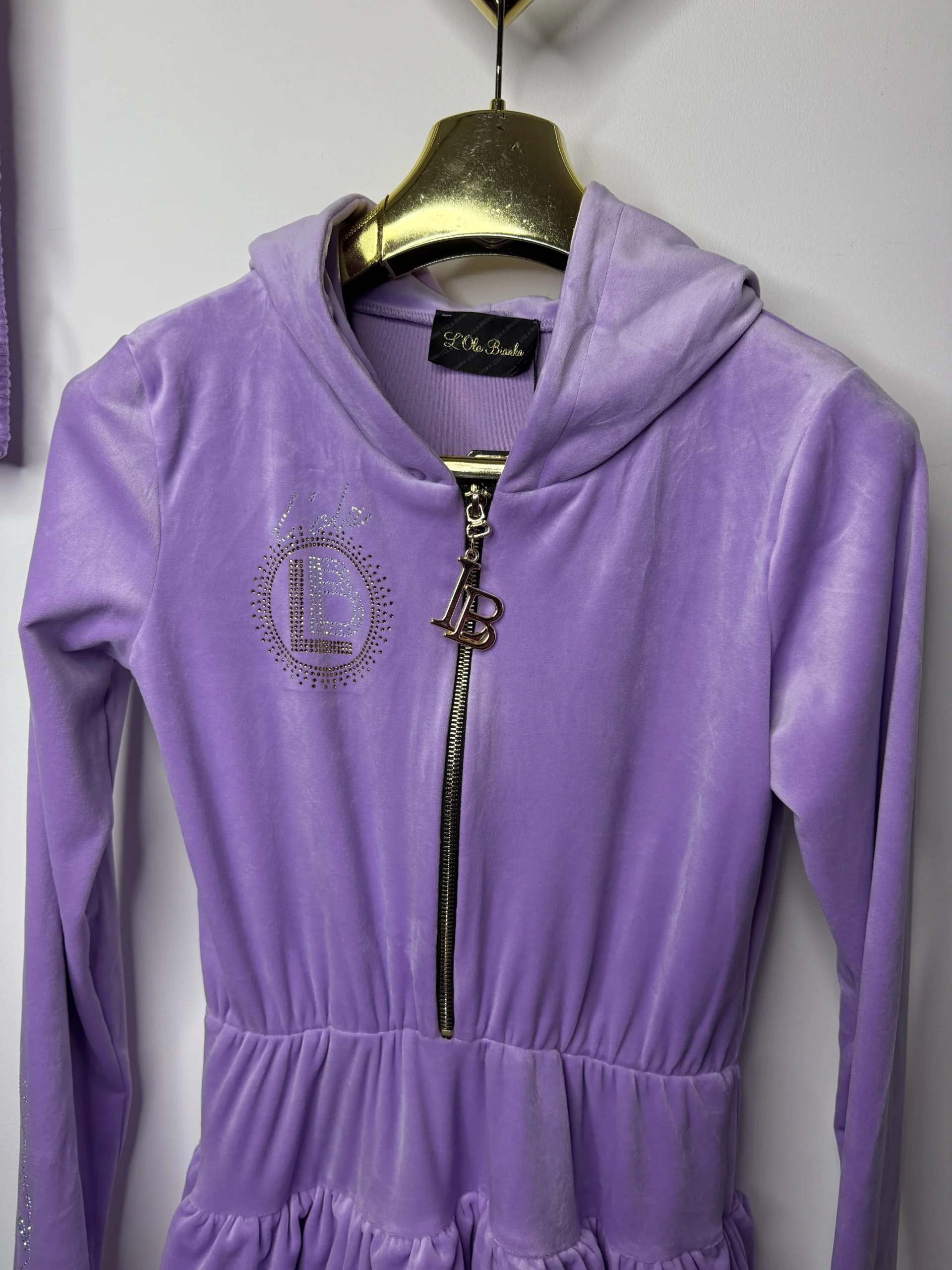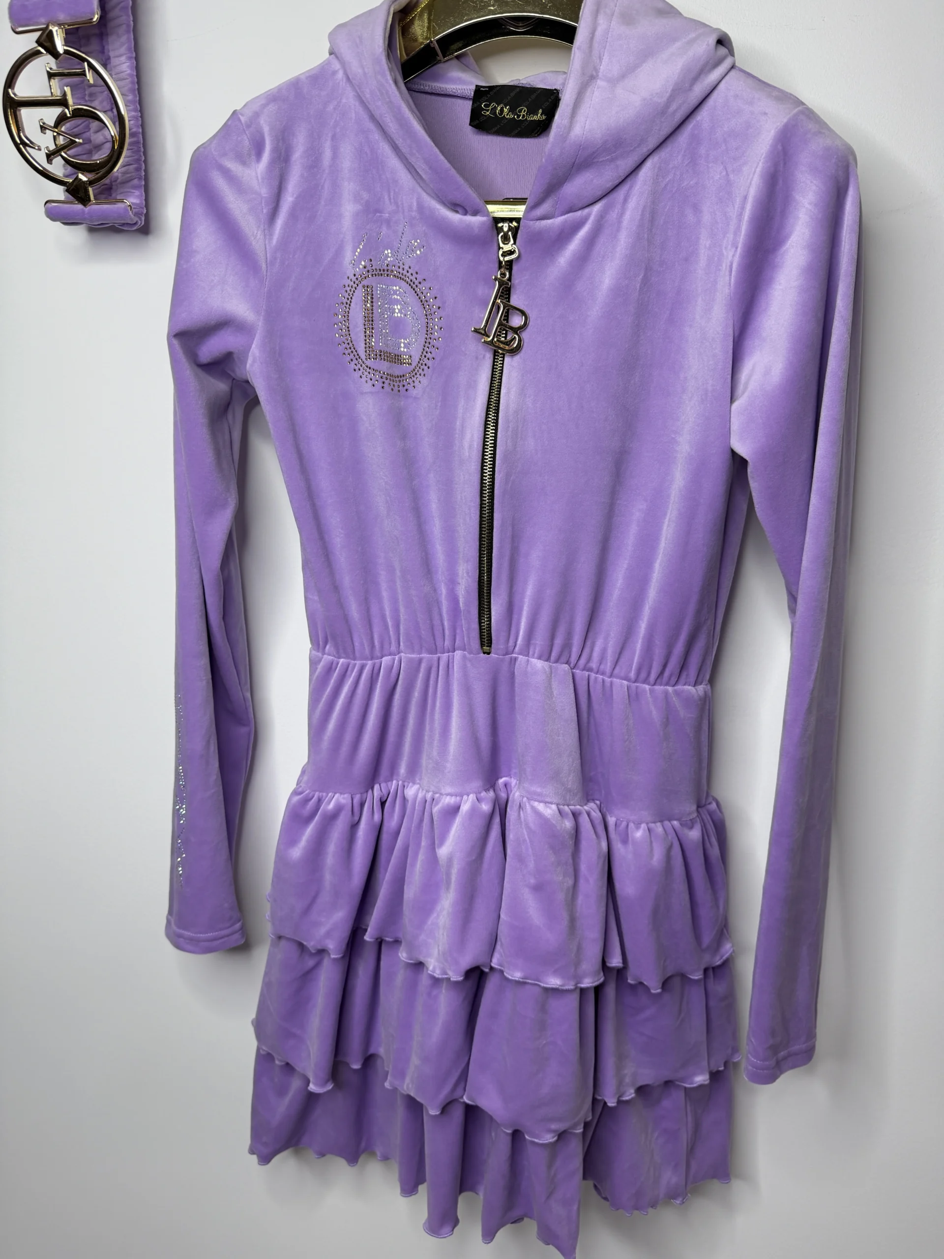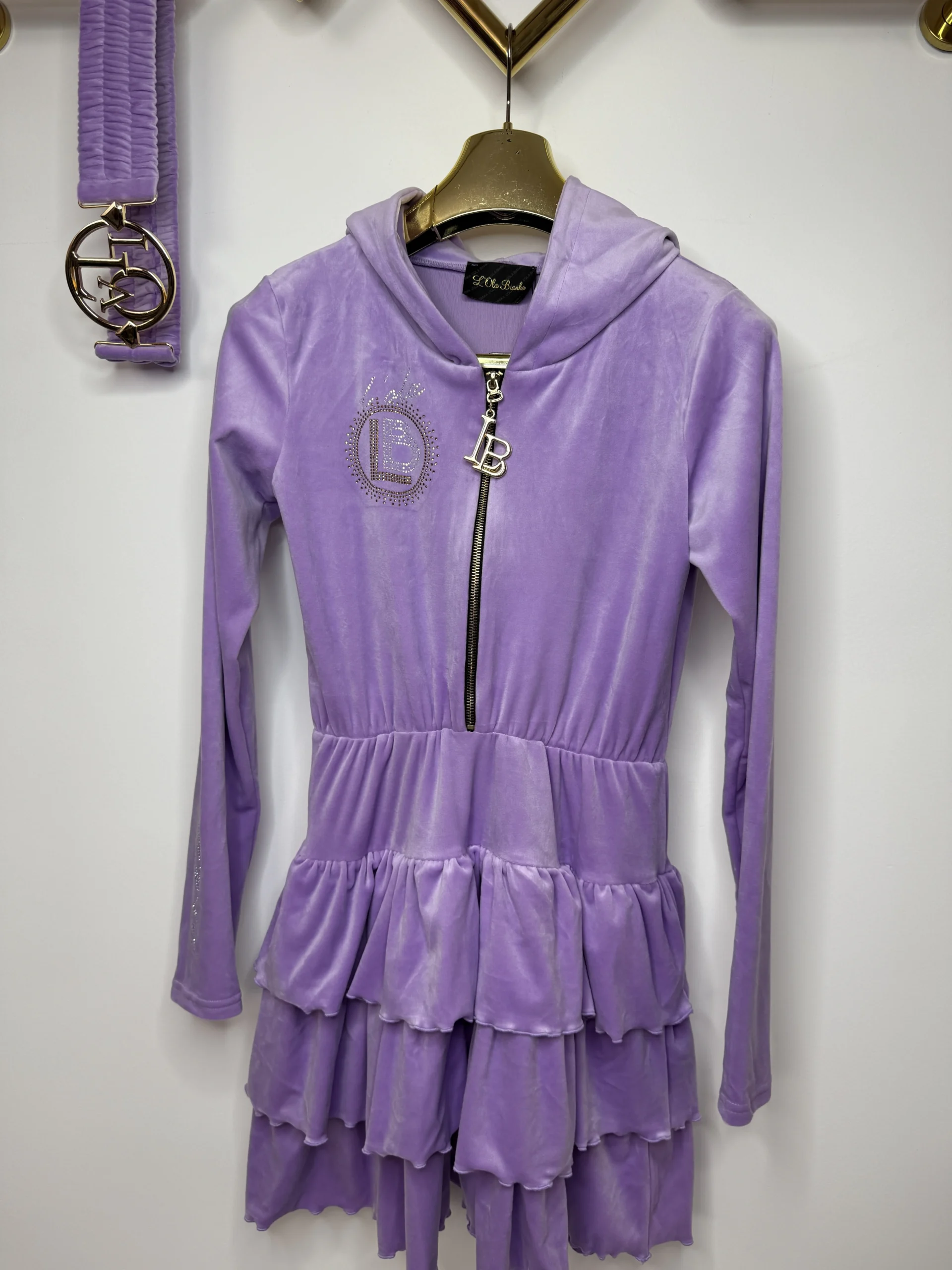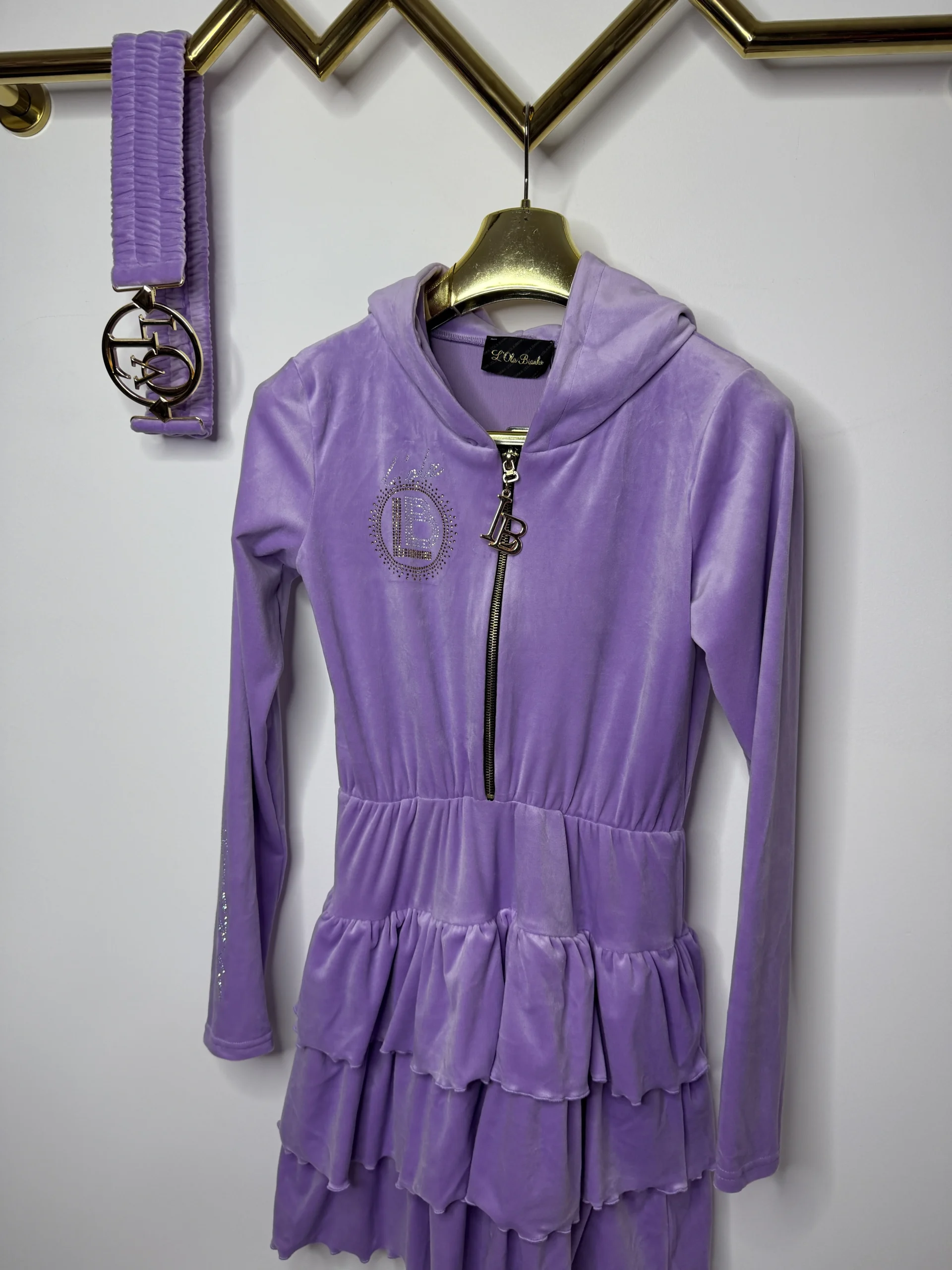 Sukienka Lola Bianka welurowa fioletowa w rozmiarze uniwersalnym, pasek na gumie z piękną klamrą.