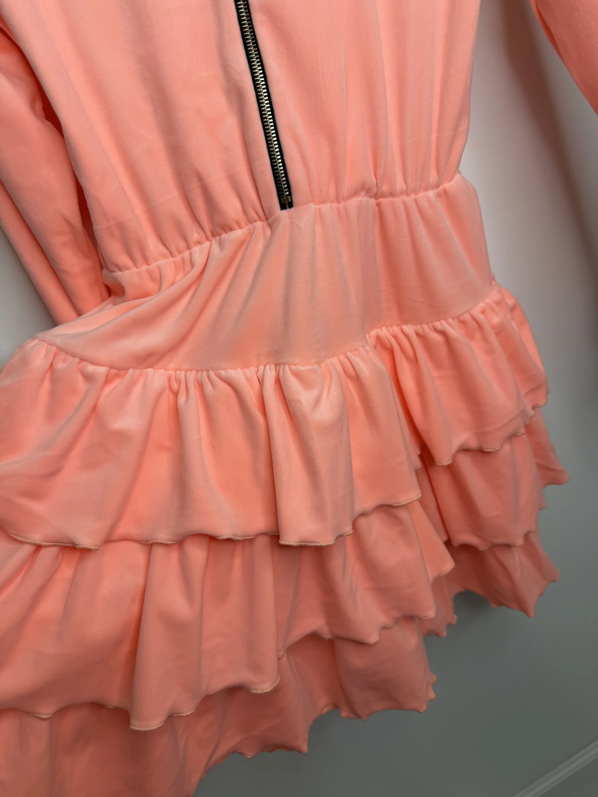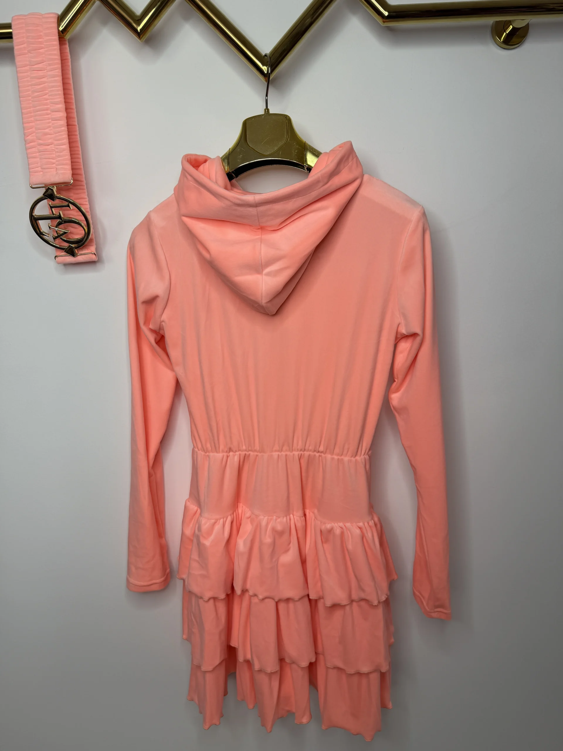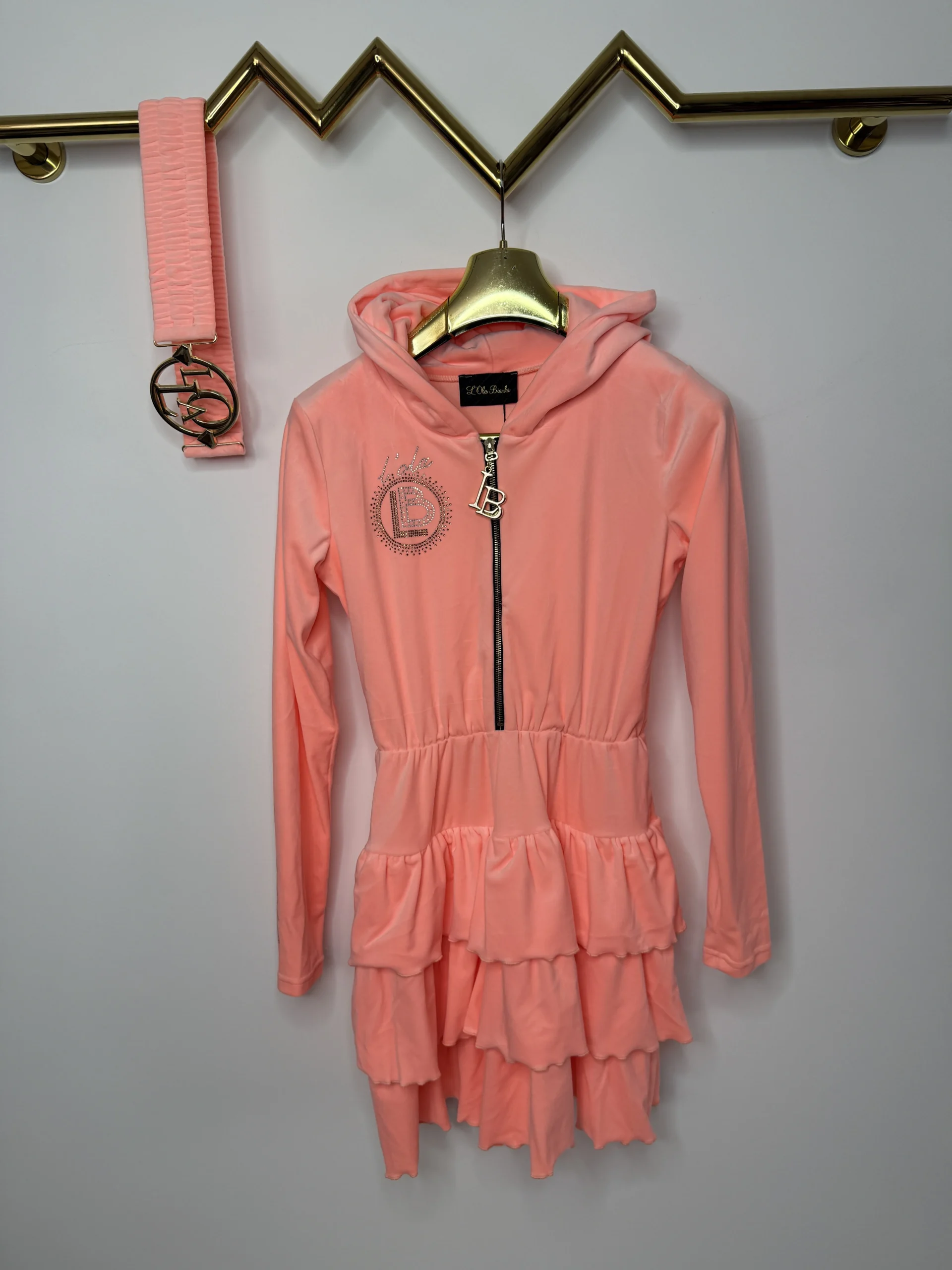 Sukienka Lola Bianka welurowa koralowa w rozmiarze uniwersalnym z pięknym paskiem na gumce z klamrą.