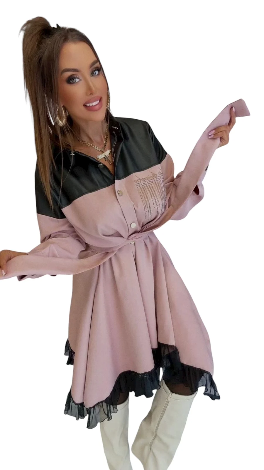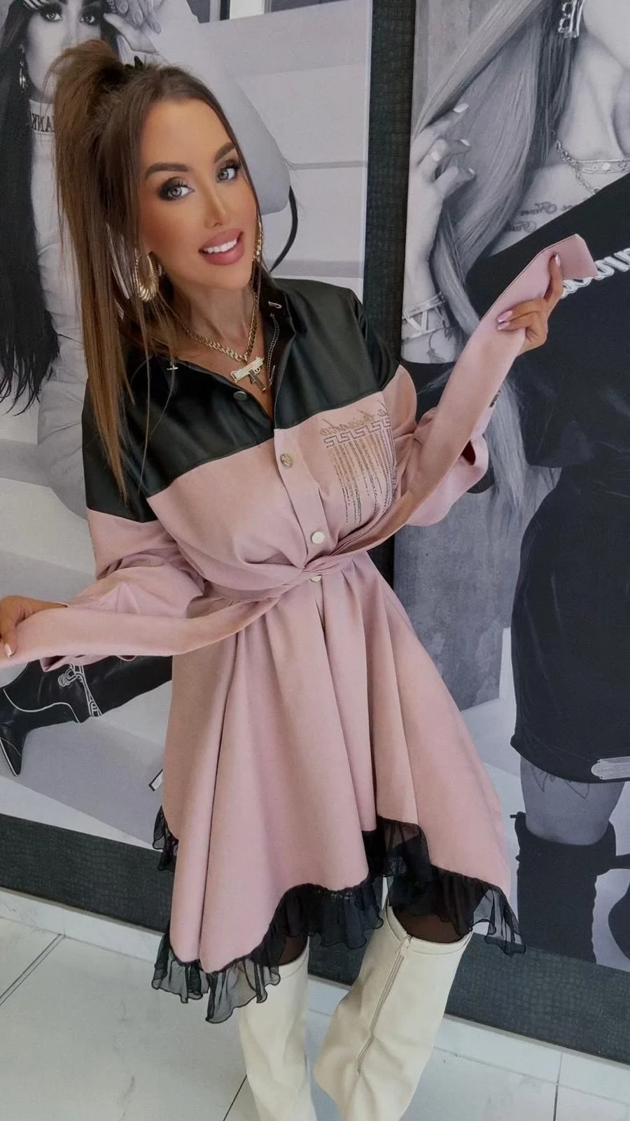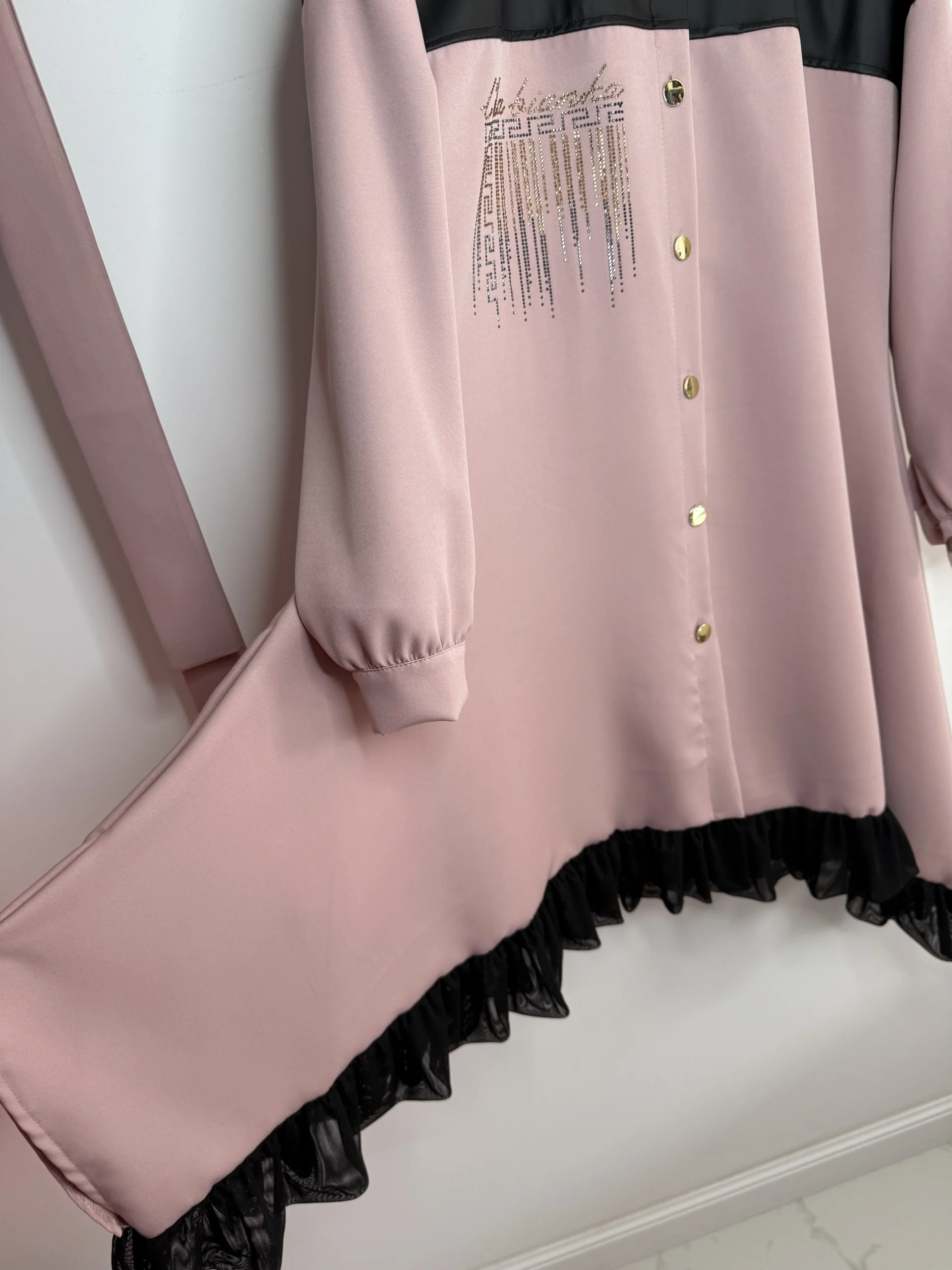 Zapinana na guziki, zdobiona cyrkoniami, na dole wykończona tiulem. Rękawek-mankiet z guzikiem. Pasek w zestawie.