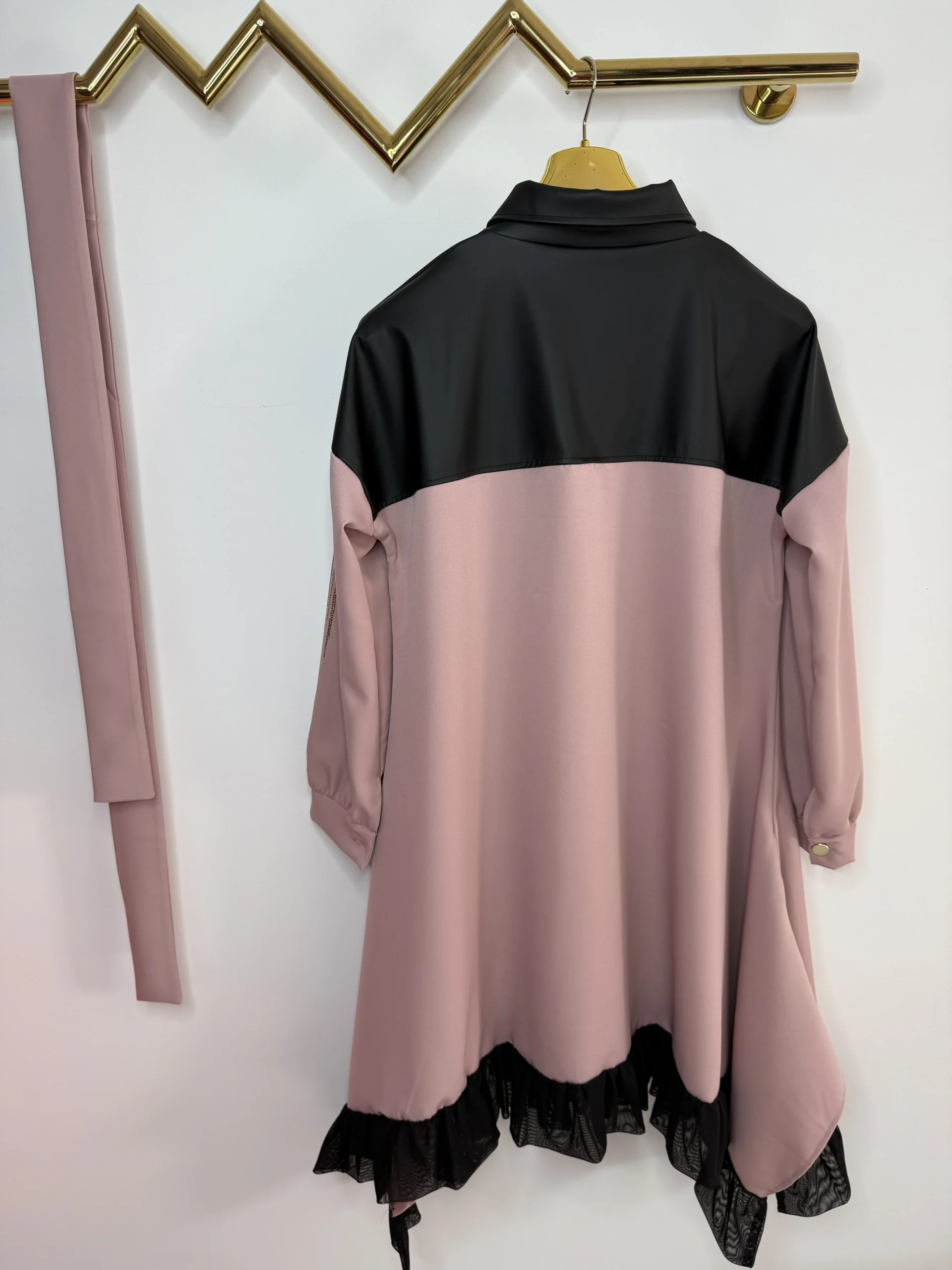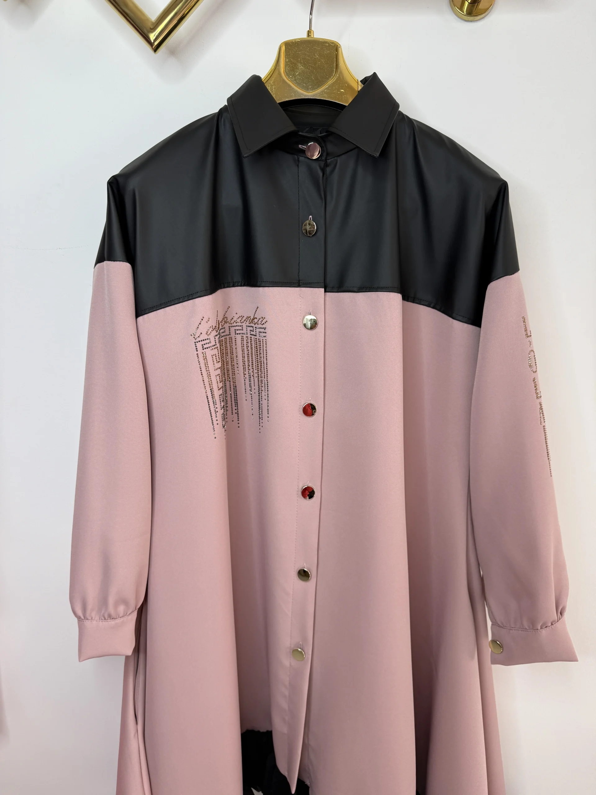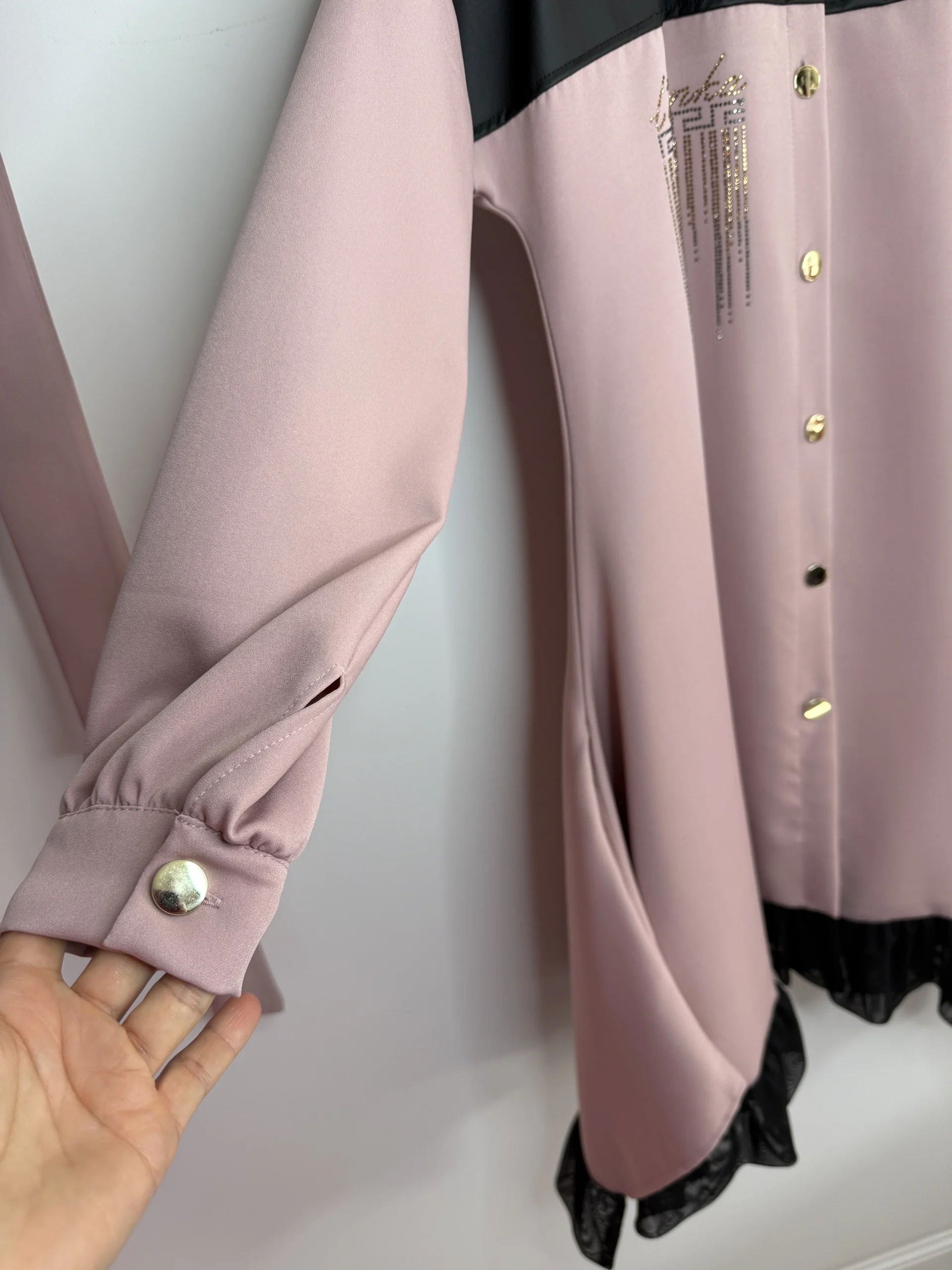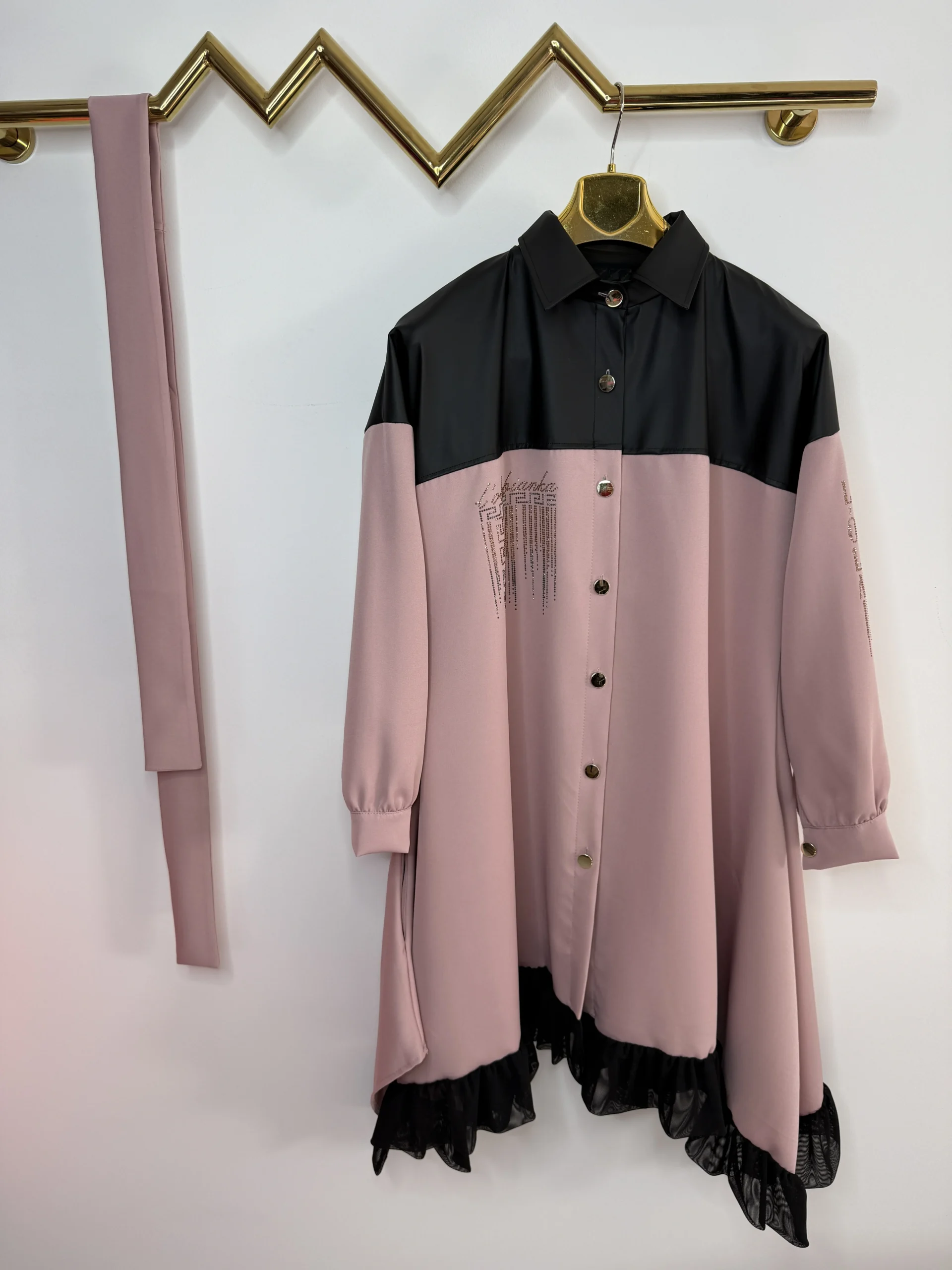 Zapinana na guziki, zdobiona cyrkoniami, na dole wykończona tiulem. Rękawek-mankiet z guzikiem. Pasek w zestawie.