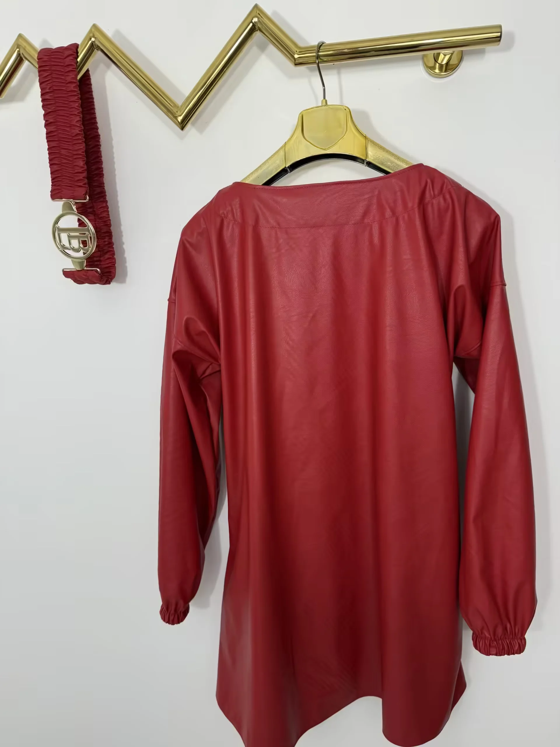 Przepiękny model klasycznej trapezowej sukienki w odcieniu matowej czerwieni, dekolt rozpinany, po bokach kieszenie, rękawek zakończony gumką , w zestawie pasek z klamrą