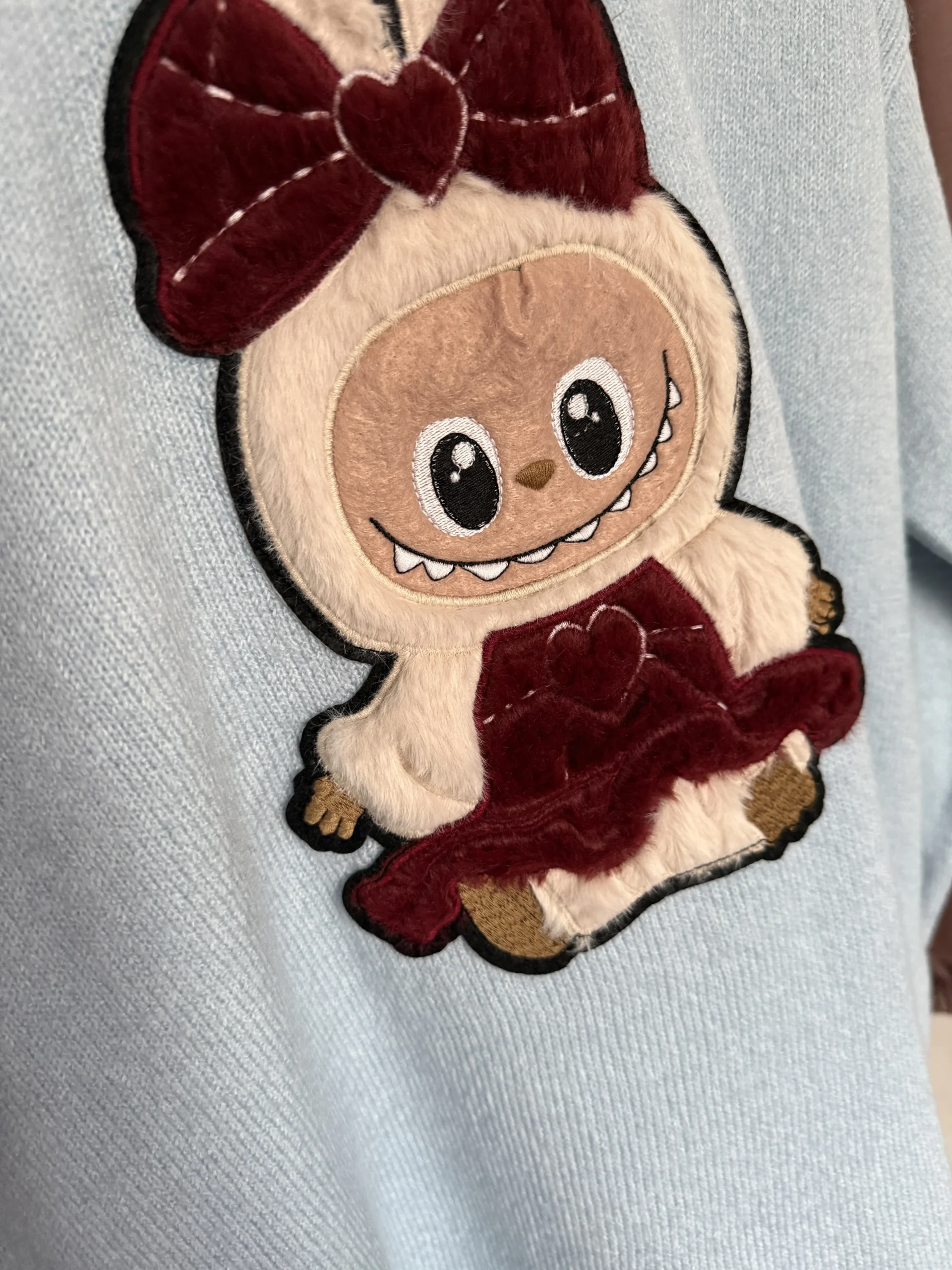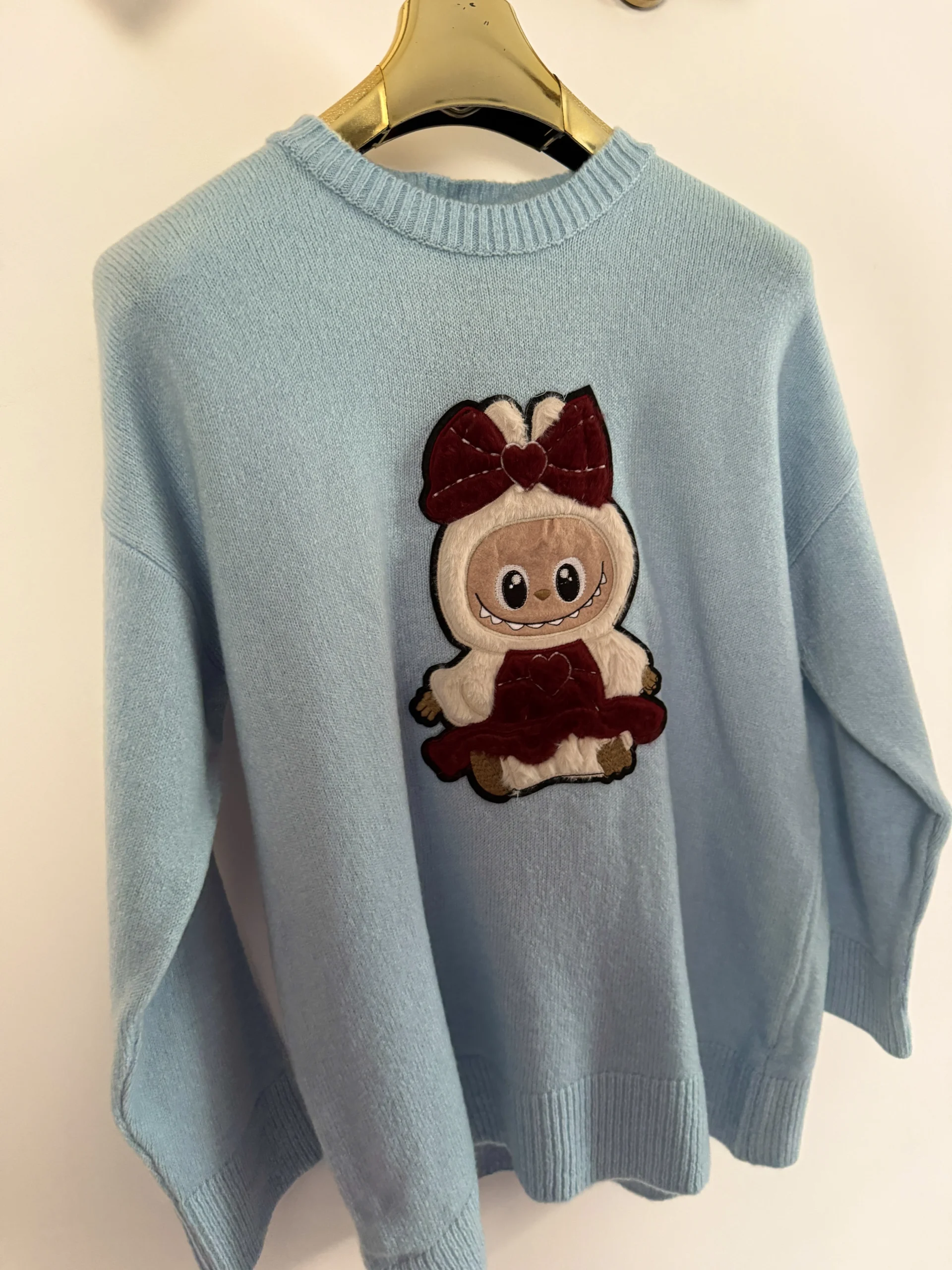 Mięciutki i wygodny. Długi rękawek, na przodzie włochate naszyte labubu nadające sweterkowi modnego oryginalnego charakteru.